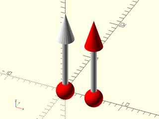 attach(TOP,BOT) recolor("green") cyl(h=5, d1=3, d2=0);